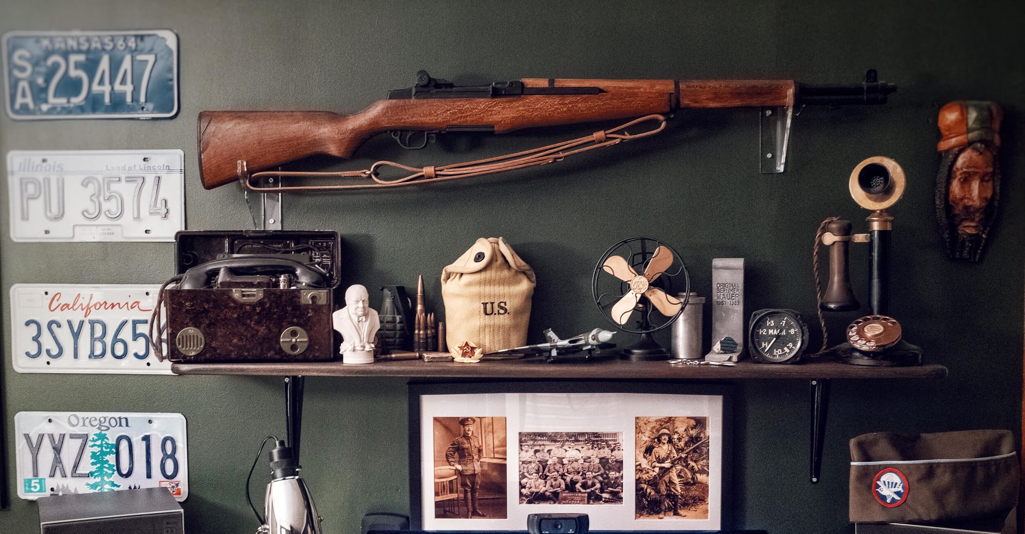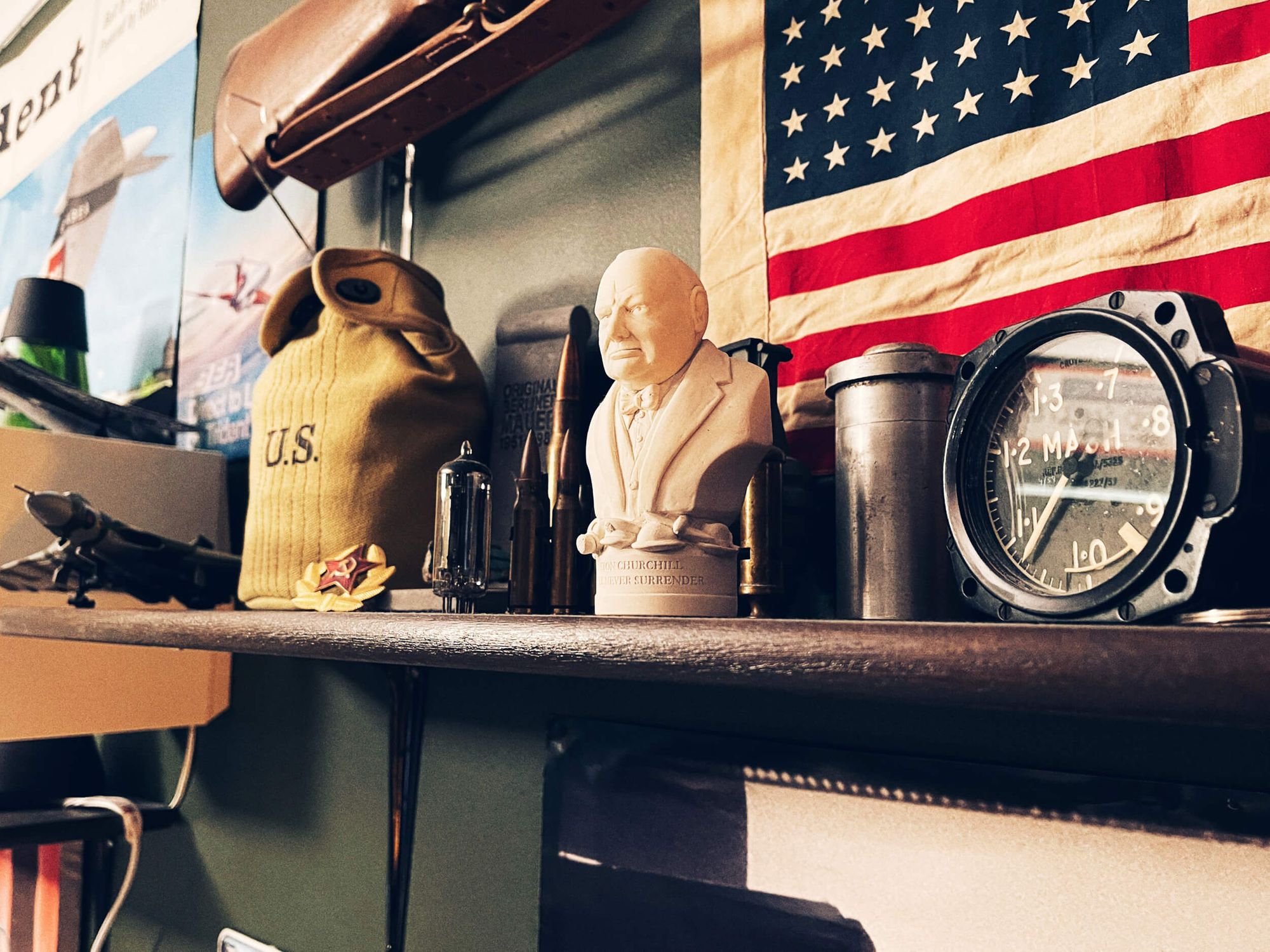 I used to be a WWII reenactor once upon a time. So I also have a few relics leftover from when I was part of an American Airborne WWII Re-enactment group. I’d say the most unique item on this shelf is the speed gauge out of an Avro Vulcan nuclear bomber.