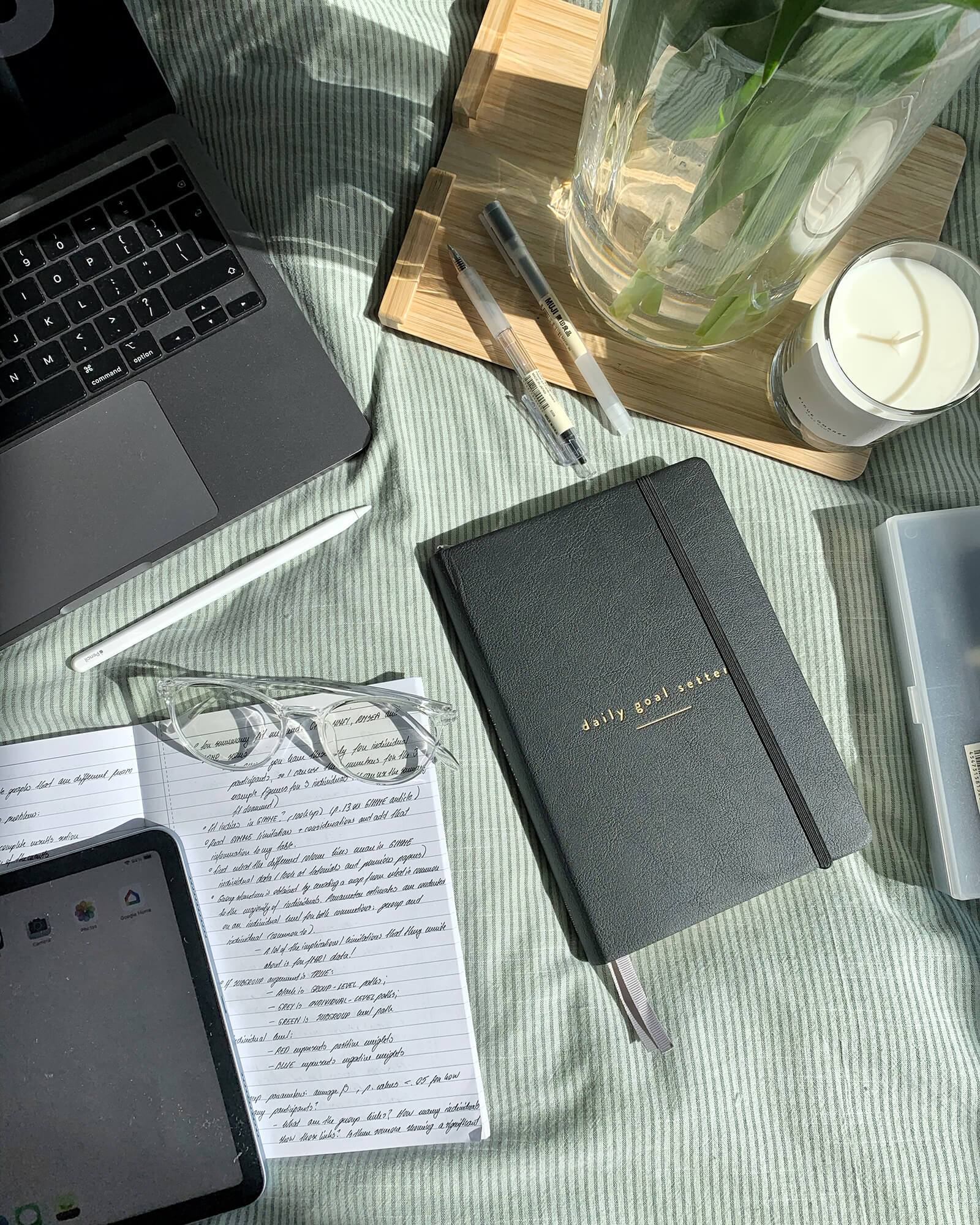 I start working on my research internship at 9 am. I love using Notion for my digital to-do lists, and my current favourite planner is from Mal Paper. It’s called Daily Goal Setter, and I love that it combines mindfulness with planning.