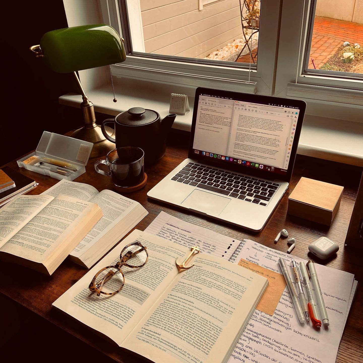 So when I get up in the morning, all I find on my desk is my MacBook and a lamp. Depending on my study flow, I add books, notebooks, and stationery throughout the day.