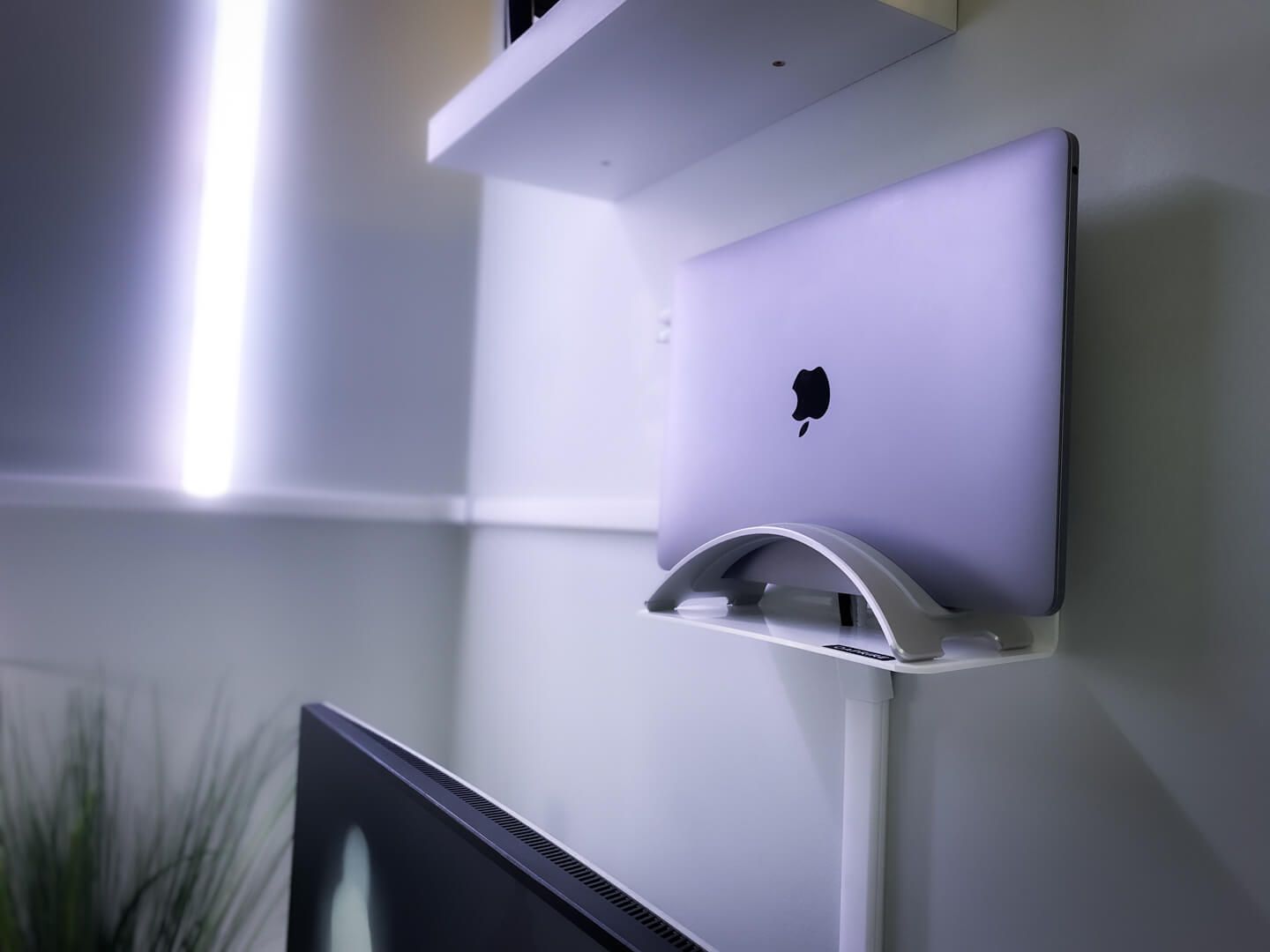 With the MacBook Pro, Alex uses Apple’s Magic Keyboard and a mouse but Razer will work just fine if needed. “With the wall-mounted MacBook, it’s just another wire routed through the cable channel in the back of the desk monitor up to the rig,” he says