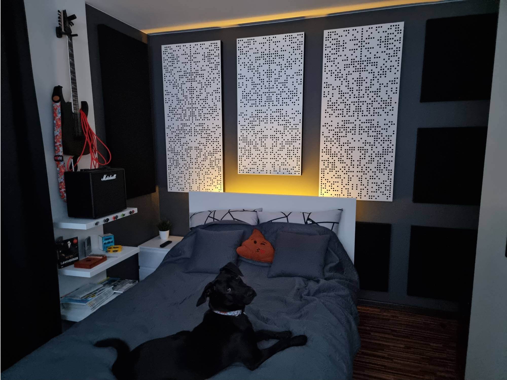 It’s rather about the whole room renovation — starting from the project through electrical wiring, acoustic treatment, etc., to the final product you can see in the photos.