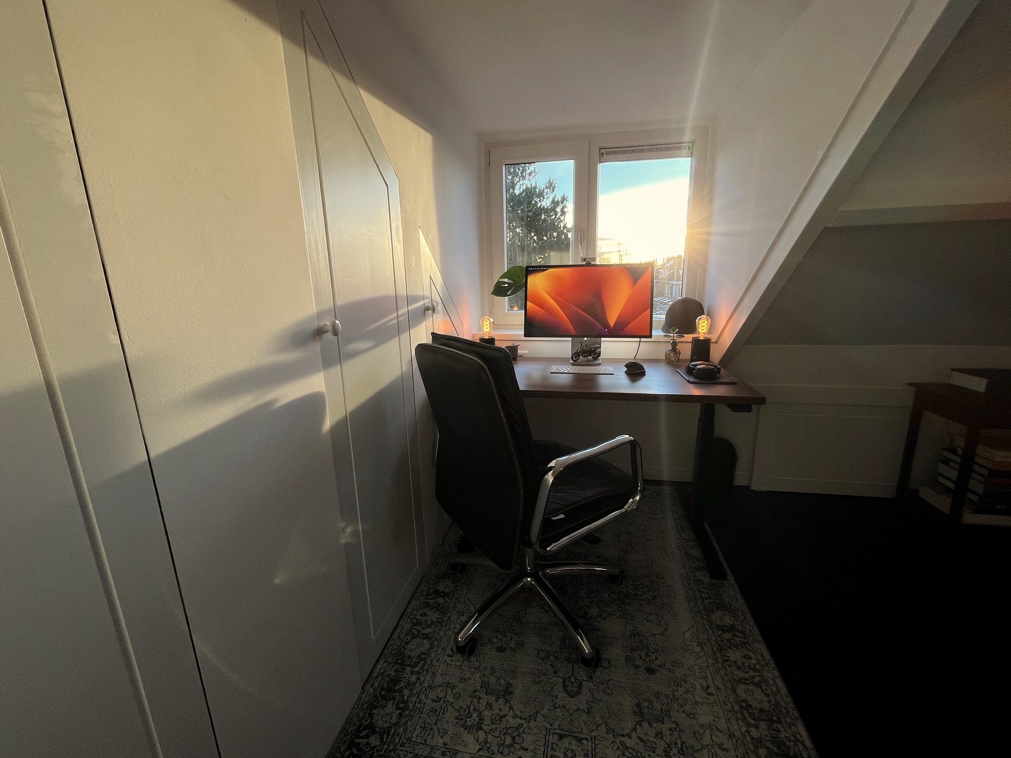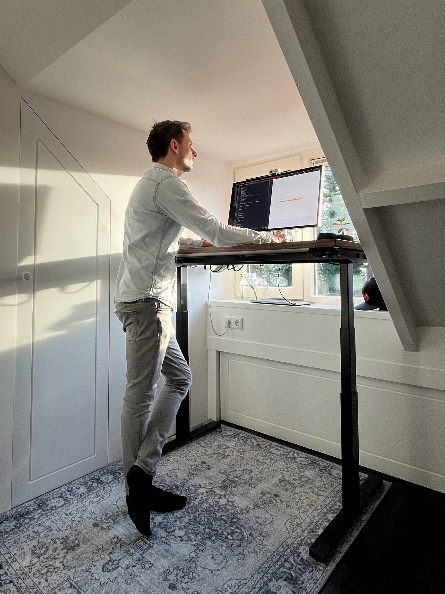 - My new walnut wood standing desk from Standidesk. It fits nicely between the dormer and window space. I’m impressed by its quality, design, and brand’s customer service.