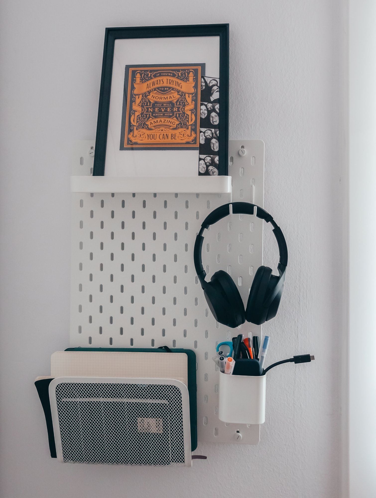 Pegboards might be known for tool storage, but Ogeh shows they can be invaluable for digital professionals in keeping things tidy.