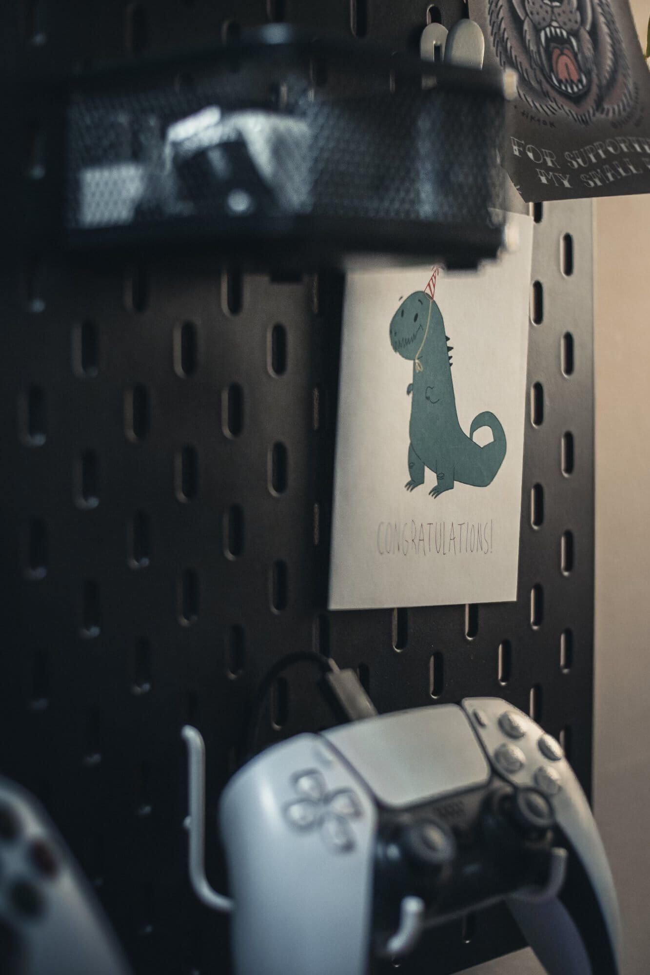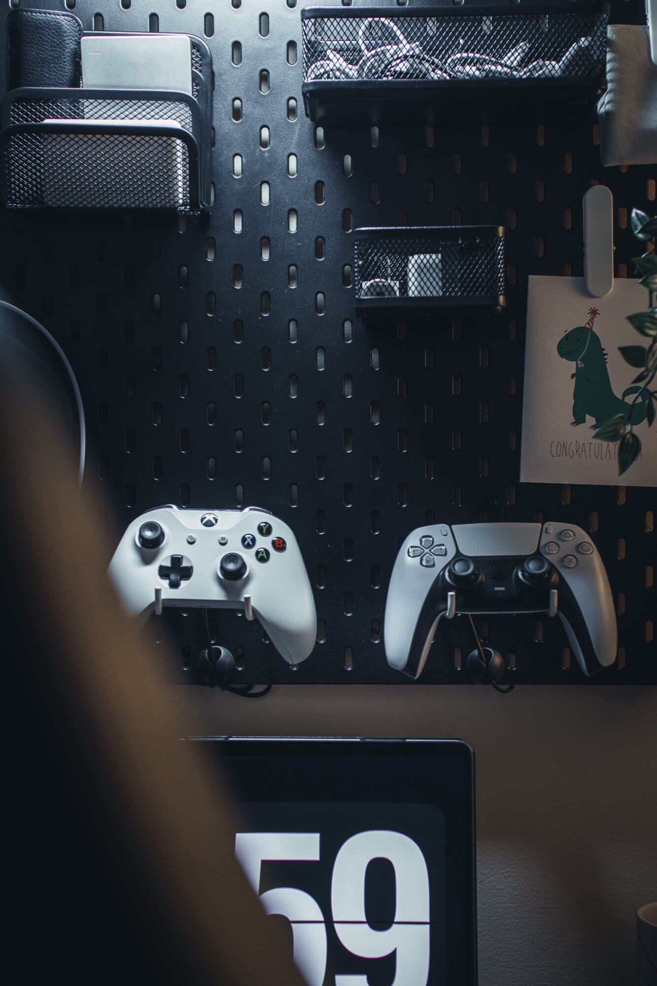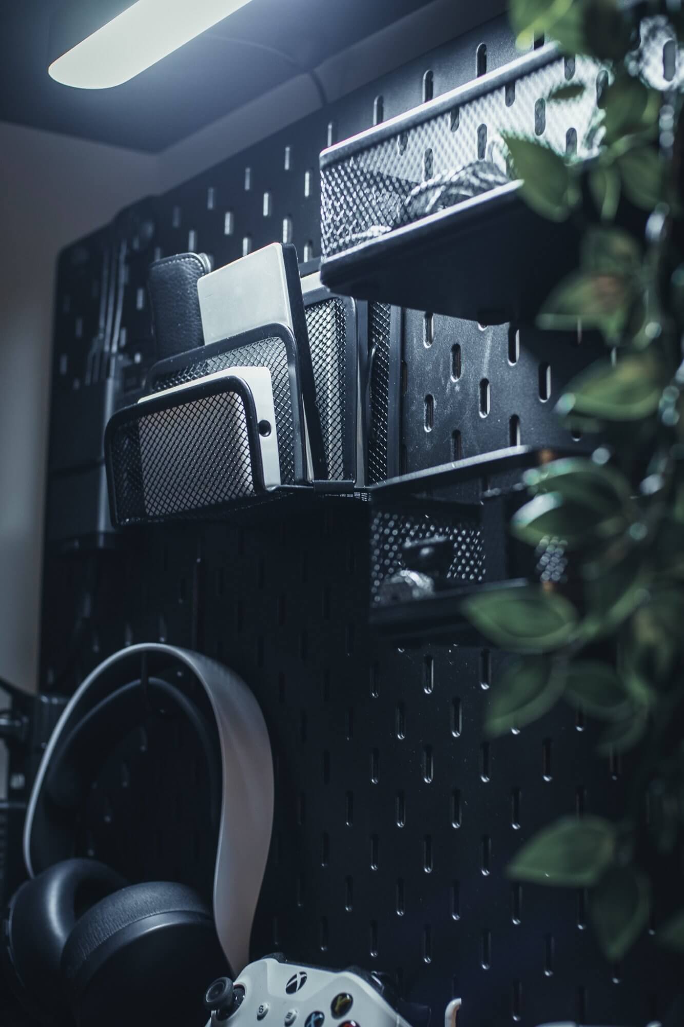 After spray-painting his SKÅDIS pegboard from IKEA to a sleek matte black, Chris hit a snag: finding those elusive compatible peg hooks for the controllers and headphones.
