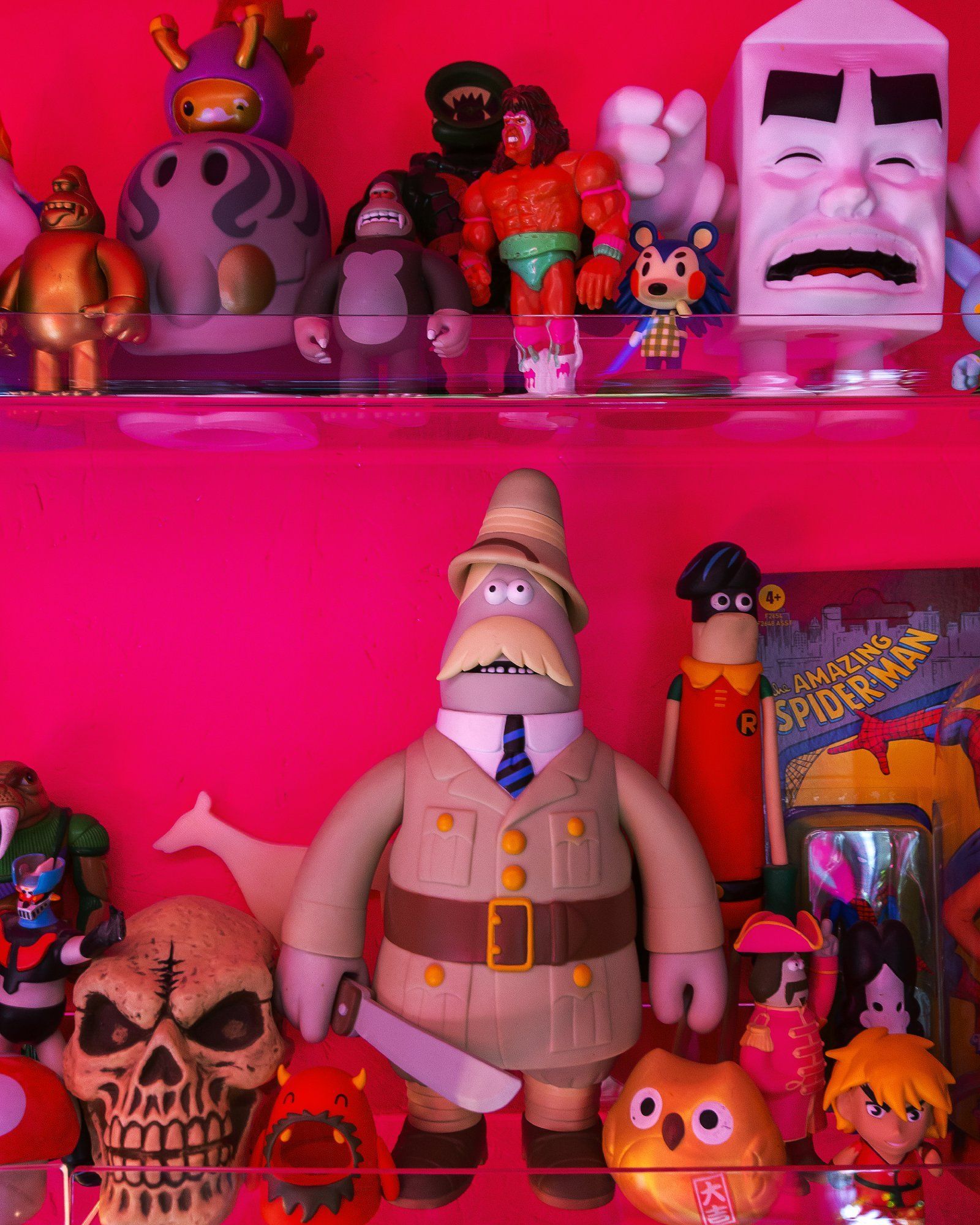 More than just looks, this den is a hub of inspiration and tech. Decked out with figurines, skateboards, masks, and more, every inch tells a story.
