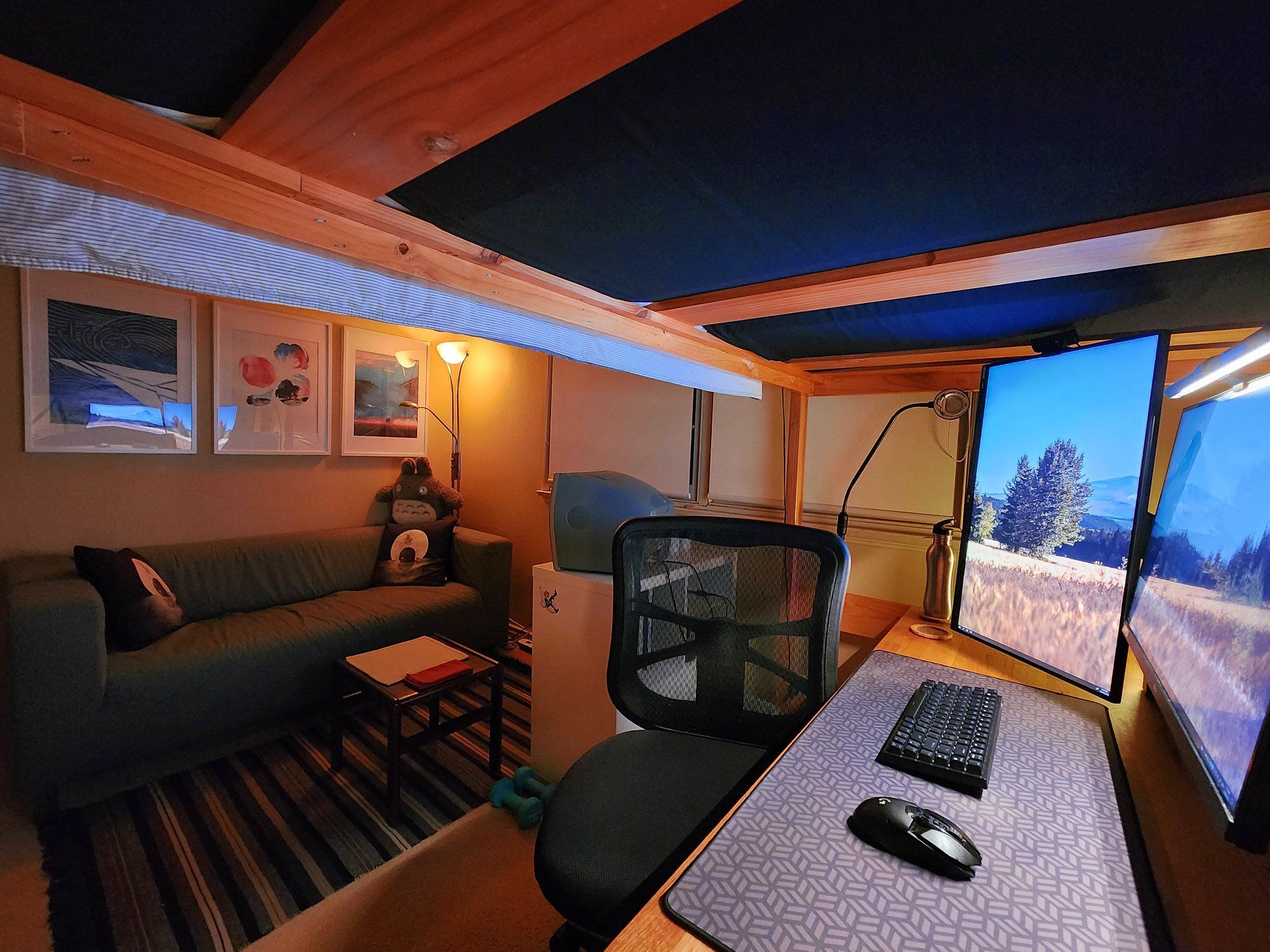 Raymond’s small loft bed home office demonstrates that, with a little creativity and thoughtful planning, even a compact space can seamlessly blend work and play.