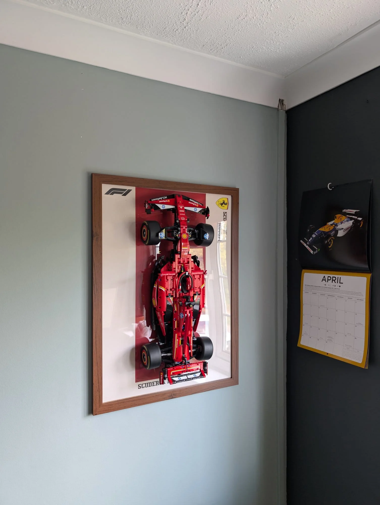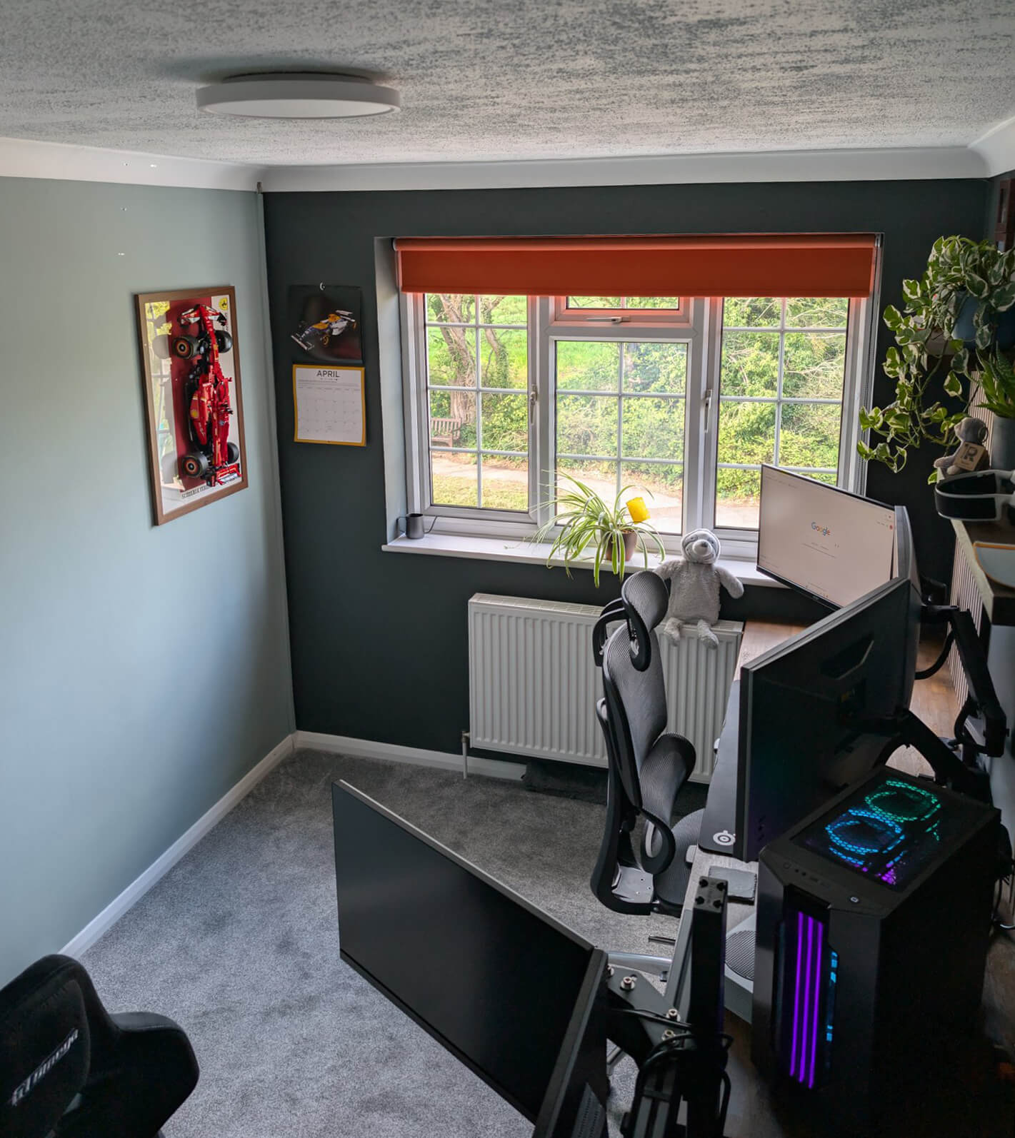 The back wall behind my desk only has one piece of wall-decoration (a wall-mounted Lego Ferrari F1 Car), and my sim rig sits on caster wheels on the other side of the room.