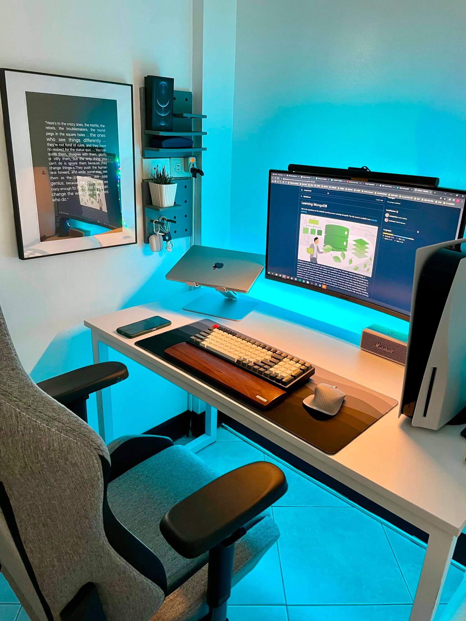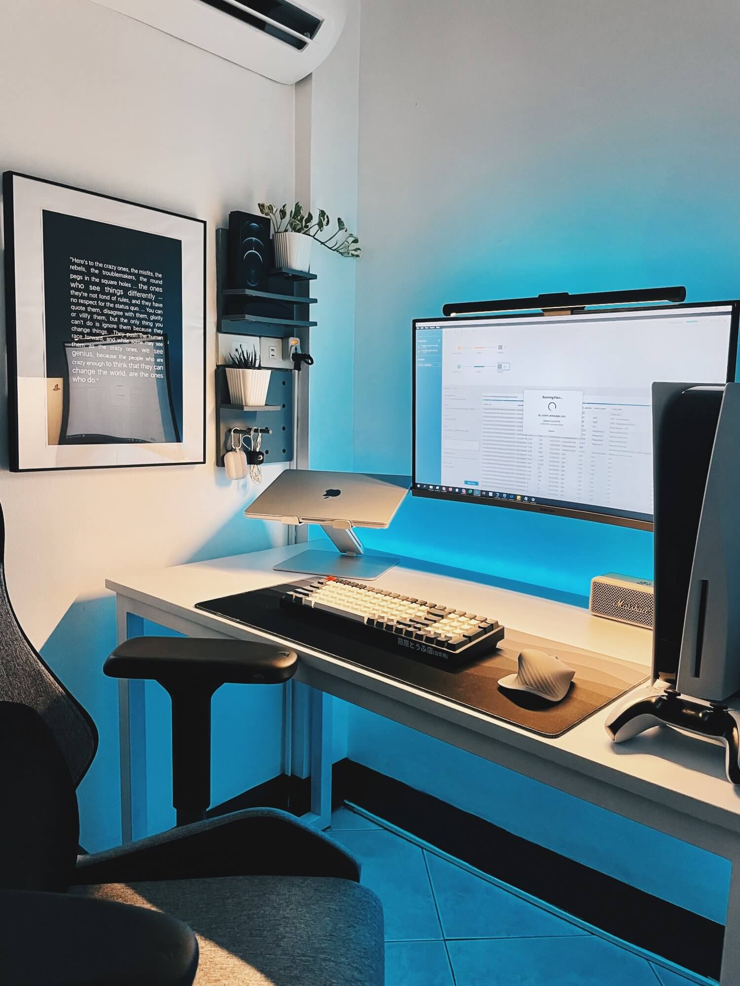Maru’s desk setup embodies minimalism in its moderate, balanced form