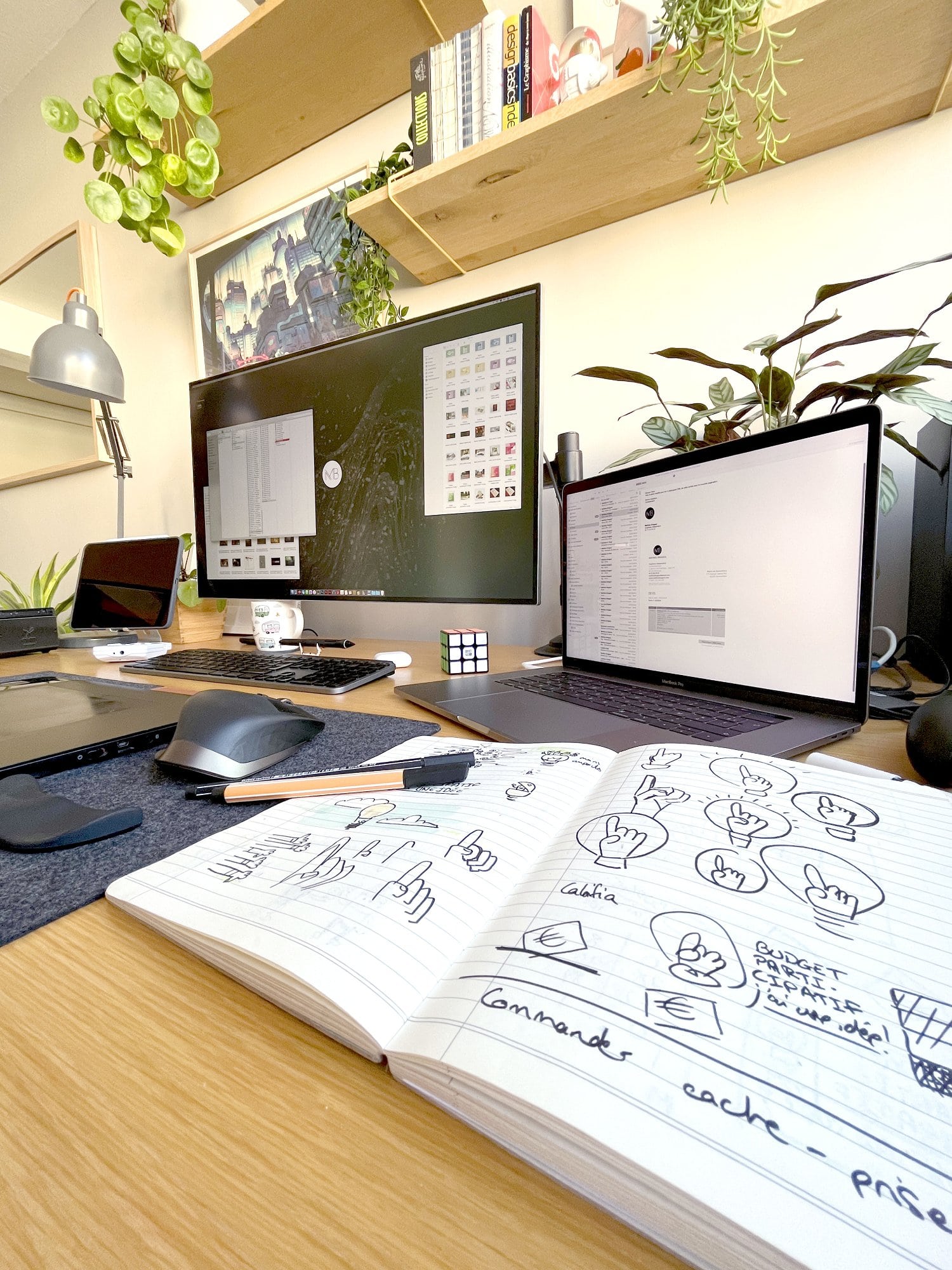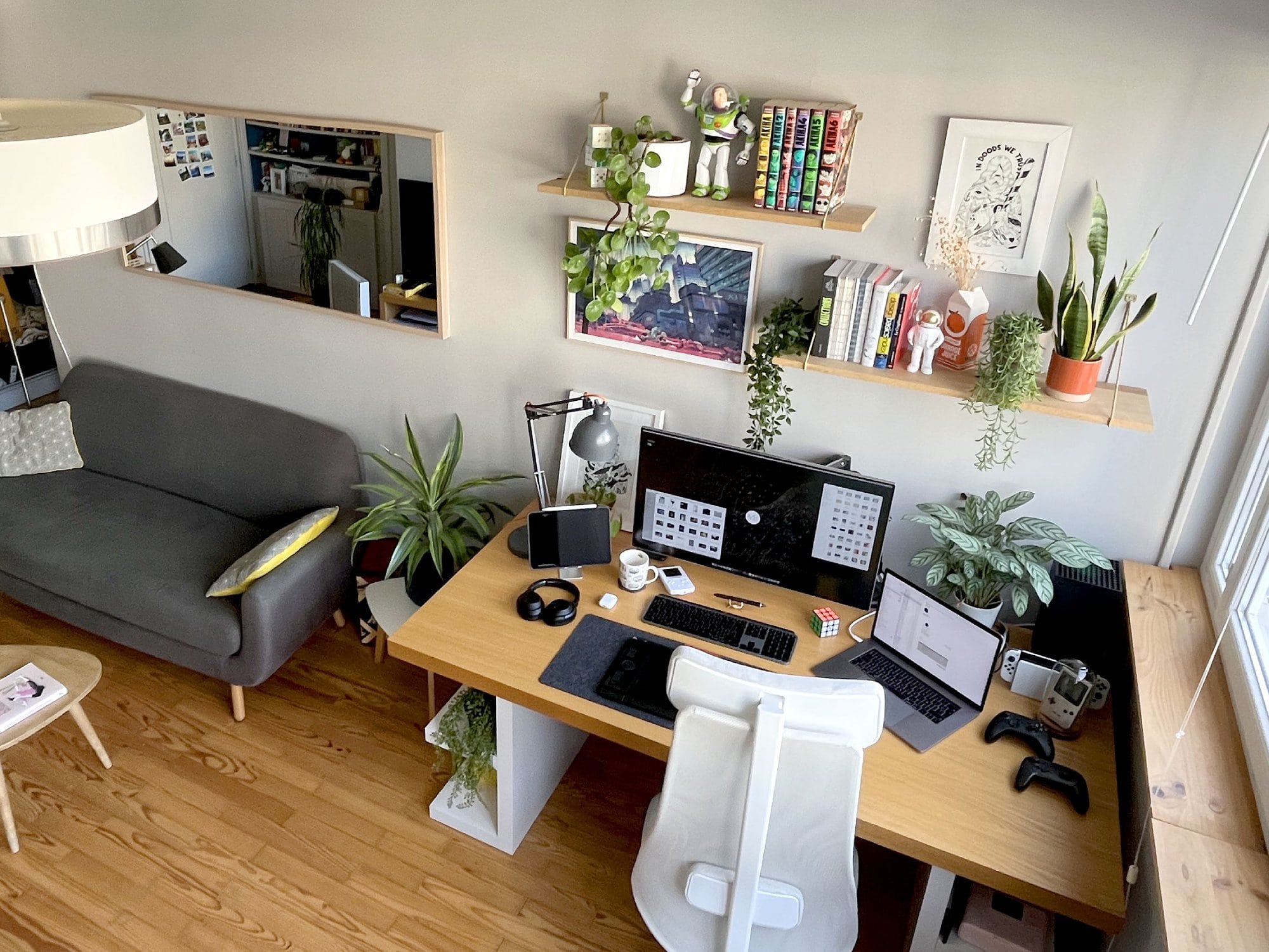 Mathieu’s design workspace setup reflects his love for drawing, playing video games, and reading
